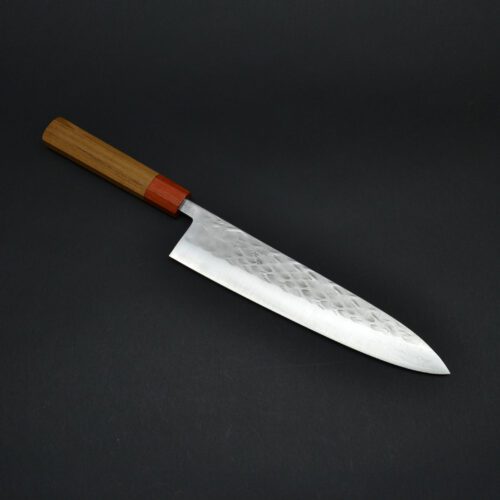• The founder of Tadafusa, Sone Torasaburo started the company from nothing in the 23rd year of the Showa era in 1948. He made various kinds of knives such as sickles, short swords and kitchen knives by using the forging techniques he learned as an apprentice making hand-forged metal scales. He gradually started to specialize in making fishing knives and then also address a need to create kitchen knives for home and professional use and special knives for Soba up to today. Since the company’s foundation, they strive to create “the best products” for customers by hand through every single process and to make each knife with utmost enthusiasm. The SLD Hammer tone series has one of the most distinctive hammered patterns in Japanese knife making. Each blacksmith has its own Tsuchime pattern. Their Tsuchime is based on geometric diamond pattern, which has been familiar from ancient times in Japan. Hitachi SLD Steel has more chromium than carbon steel such as Blue Paper Steel or White Paper Steel, which means that it is more resistant to rust but not fully stainless (semi stainless). Also, it holds a sharp edge and a long edge retention by its hardness and toughness. It is popular steel for kitchen knives in Japan. Meaning “Beef knife” in Japanese, the Gyuto is the most common and basic of all knives, the Japanese version of the classic western Chef’s knife. It is used as a multi-purpose knife, suitable for meat, fish, vegetables and more. Can be used with almost all different cutting techniques. The 240mm size is to be used both by professional and experienced home cooks.