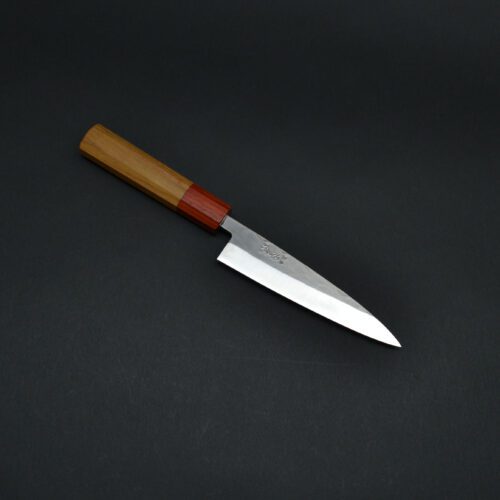 The founder of Tadafusa, Sone Torasaburo started the company from nothing in the 23rd year of the Showa era in 1948. He made various kinds of knives such as sickles, short swords and kitchen knives by using the forging techniques he learned as an apprentice making hand-forged metal scales. He gradually started to specialize in making fishing knives and then also address a need to create kitchen knives for home and professional use and special knives for Soba up to today. Since the company’s foundation, they strive to create “the best products” for customers by hand through every single process and to make each knife with utmost enthusiasm. The SLD Hammer tone series has one of the most distinctive hammered patterns in Japanese knife making. Each blacksmith has its own Tsuchime pattern. Their Tsuchime is based on geometric diamond pattern, which has been familiar from ancient times in Japan. Hitachi SLD Steel has more chromium than carbon steel such as Blue Paper Steel or White Paper Steel, which means that it is more resistant to rust but not fully stainless (semi stainless). Also, it holds a sharp edge and a long edge retention by its hardness and toughness. It is popular steel for kitchen knives in Japan. The Petty is one of the most commonly used knives in the kitchen. A small, general-purpose knife used for peeling, shaping, and slicing fruits and vegetables, chopping herbs, and making garnishes that also can be used in handheld cuts. The 135mm size is just right!