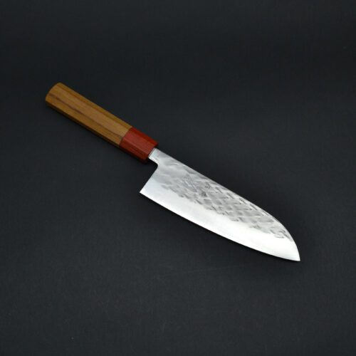 The founder of Tadafusa, Sone Torasaburo started the company from nothing in the 23rd year of the Showa era in 1948. He made various kinds of knives such as sickles, short swords and kitchen knives by using the forging techniques he learned as an apprentice making hand-forged metal scales. He gradually started to specialize in making fishing knives and then also address a need to create kitchen knives for home and professional use and special knives for Soba up to today. Since the company’s foundation, they strive to create “the best products” for customers by hand through every single process and to make each knife with utmost enthusiasm. The SLD Hammer tone series has one of the most distinctive hammered patterns in Japanese knife making. Each blacksmith has its own Tsuchime pattern. Their Tsuchime is based on geometric diamond pattern, which has been familiar from ancient times in Japan. Hitachi SLD Steel has more chromium than carbon steel such as Blue Paper Steel or White Paper Steel, which means that it is more resistant to rust but not fully stainless (semi stainless). Also, it holds a sharp edge and a long edge retention by its hardness and toughness. It is popular steel for kitchen knives in Japan. With a tall blade and rounded nose, the Santoku is a versatile, all over, knife that is suitable for cutting meat, fish, or vegetables. The name Santoku means “Three-purpose” (virtues). Used mainly with chopping and push cuts by most Japanese like a general use chef knife.