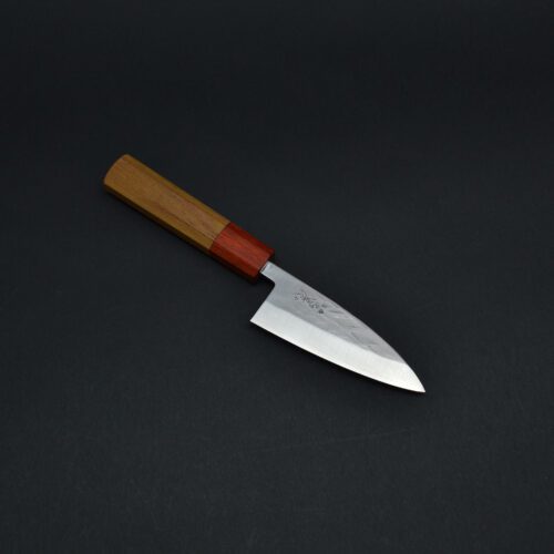 • The founder of Tadafusa, Sone Torasaburo started the company from nothing in the 23rd year of the Showa era in 1948. He made various kinds of knives such as sickles, short swords and kitchen knives by using the forging techniques he learned as an apprentice making hand-forged metal scales. He gradually started to specialize in making fishing knives and then also address a need to create kitchen knives for home and professional use and special knives for Soba up to today. Since the company’s foundation, they strive to create “the best products” for customers by hand through every single process and to make each knife with utmost enthusiasm. The SLD Hammer tone series has one of the most distinctive hammered patterns in Japanese knife making. Each blacksmith has its own Tsuchime pattern. Their Tsuchime is based on geometric diamond pattern, which has been familiar from ancient times in Japan. Hitachi SLD Steel has more chromium than carbon steel such as Blue Paper Steel or White Paper Steel, which means that it is more resistant to rust but not fully stainless (semi stainless). Also, it holds a sharp edge and a long edge retention by its hardness and toughness. It is popular steel for kitchen knives in Japan. The Honesuki is a rather small knife specifically created for filleting chicken and poultry. It’s the Japanese equivalent to the boning knife with a flatter and higher profile. This design makes it easy to chop through the joints of the chicken (rabbits etc) when you ‘re filleting them. The tip of the knife is usually thin, so it can glide easily through flesh. The heel of the blade is used for hard bits, and the tip is used for articulate slicing. The 150mm is the most common size.