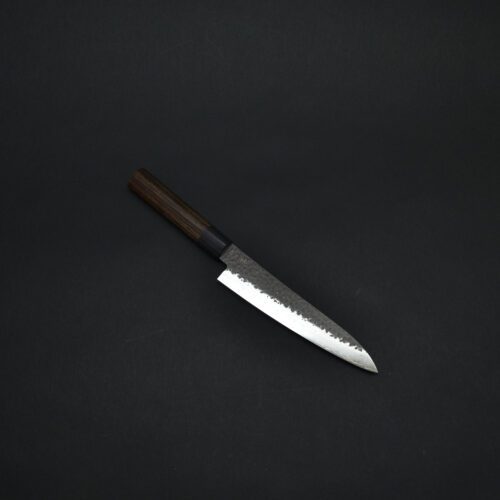 Out of stockSeki City, located in the middle basin of the Nagara River, is regarded as one of the world’s three major cutlery centers. Knifes in SEKI has been special since they follow in the footsteps of the first craftsman back 780 years ago. Master sword smith Hiroshige moved to Seki from Kyusyu and began making swords. Blacksmith of Seki and Seki city honor the Hiroshige as a founder of sword smith of Seki. The secret behind the international success of the blade industry here in Seki lies in its roots as a sword-production center manufactures have harnessed the ancient knowledge and techniques of Japanese swordsmiths and are able to combine it with modern day technology to create high-quality cutlery and blades. Way back in the 50s, he founder of SHIZU grew in SEKI city, the city of blacksmith, and naturally became a craftsman. Swords of SEKI were known as Dose NOT Snap, Dose NOT Bend and Do Cut well, so the founder showed his respect by naming his company after an ancient blacksmith. Gen (玄) means BLACK and EXPERT in Japan. The distinctive iron black and Damascus pattern make you feel the beauty and depth of Japanese harmony. Japanese traditional laminated wood handle 'shape of chestnut naturally grips the hand, and the hammer on the blade helps food release. Made of the well known traditional VG-10 stainless steel, features a nice mixed finish of Hammered / Kurouchi / Damascus 33 layers patterns. A metal part used in the joining of handle and blade, improves security and stability. The Petty is one of the most commonly used knives in the kitchen. A small, general-purpose knife used for peeling, shaping, and slicing fruits and vegetables, chopping herbs, and making garnishes that also can be used in handheld cuts. This is a larger version of the usual pettys and can be used as a utility / small gyuto.