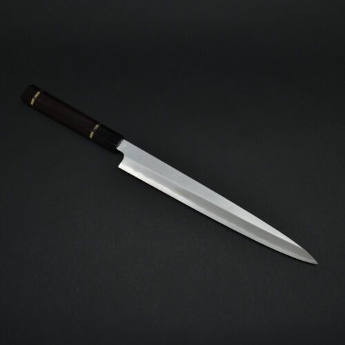 Established in 1872 by Mastersmith Torakichi Mizuno in Sakai City in Osaka, Mizuno Tanrenzo became famous for producing the traditional Japanese knives ‘Sakai Uchi’. For 5 generations, the Mizuno family has been recognized as one of the most important family of craftsmen in Japan. A Mayokegama (a sickle to face evil), made by 2nd generation blacksmith Masanori Mizuno, is still decorating the roof of Houryuji temple in Nara, Japan's oldest five story building registered as a National Treasure and the World Heritage monument by UNESCO. Mizuno Tanrenzo workshop is for years the favourite of Japan’s Royal family and has received visits from its members. Today is led by 5th generation blacksmith Jun Mizuno with the precious help of his wife Nanako who is taking care of all non blacksmithing business. Because of his amazing craftsmanship, Jun Mizuno has been appointed by two of Japan’s top shrines who selected his katanas to be in the shrines’ permanent collections. A hand forged series by Master Jun Mizuno, made of Aogami-2 steel with an iron soft cladding. Sharpened by one of the most experienced sharpeners Tsutomu Minamiura, with Kasumi finish and superb thin grinds, overall and behind the edge. Mounted with a beautiful Wa octagonal handle in black Sandalwood with black buffalo horns and copper rings on both ends. The Yanagiba (meaning willow leaf blade) is the traditional Japanese Sashimi knife. Used mainly to cut thin slices of fish in one draw, without damaging the cells of the delicate fish protein. It can also be used for meat. The 270mm size is the most common for medium and large pieces of fillets. Important Note: It is usual that Japanese Handmade knives do not come sharpened at their full potential out of the box. This is due to Japanese mentality that the owner and user should give the final sharpening to his or her knives. This is also the case for Mizuno Tanrenzo knives. If you are not an experienced sharpener, let us give your knife an extra sharpening to reach it’s full potential by clicking on the Extra Sharpening request. This is a Carbon Steel knife and not a stainless one. Requires attention and care in its maintenance like quick washing and drying after use, storing in low humidity area and application of mineral oil if not used for some time. Over time it will form a patina that will protect it from rust. In case rust appears, use baking soda on wet blade, leave it for 10 mins and rub carefully with your finger or a soft sponge. In case rust is not removed, contact us for further instructions.
